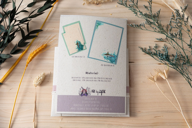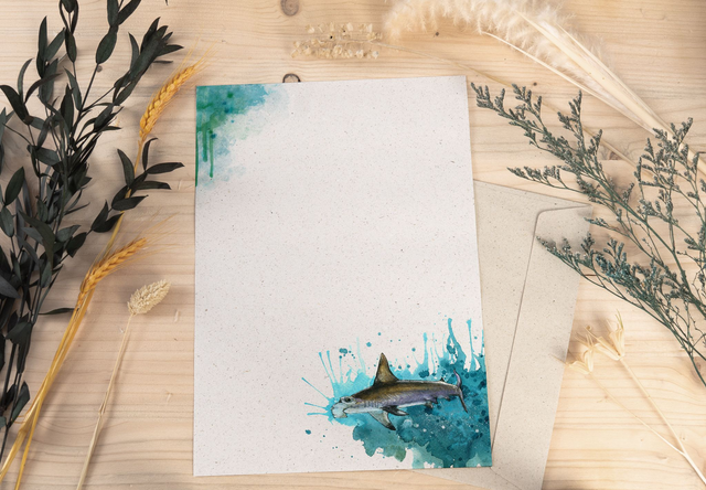 Dieses Briefpapier-Set mit Hammerhai-Motiv bringt die Faszination des Meeres direkt auf deinen Schreibtisch. Das handgemalte Design zeigt den beeindruckenden Hammerhai in seiner natürlichen Eleganz und verleiht deinen Briefen einen besonderen, künstlerischen Touch. Ideal für alle, die das Meer lieben und eine Vorliebe für außergewöhnliche Designs haben. Hergestellt aus umweltfreundlichem Graspapier, ist dieses Set eine perfekte Kombination aus Nachhaltigkeit und Kreativität.