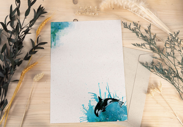 Dieses Briefpapier-Set ist perfekt für alle Meeresliebhaber, die den majestätischen Orca verehren! Das Set zeigt eine handgemalte Illustration des Orcas, die mit ihren lebendigen Farben und dem dynamischen Design jede Nachricht zu etwas Besonderem macht. Mit seiner umweltfreundlichen Herstellung aus Graspapier setzt du nicht nur ein Zeichen für die Umwelt, sondern verleihst deinen Briefen auch eine einzigartige künstlerische Note.