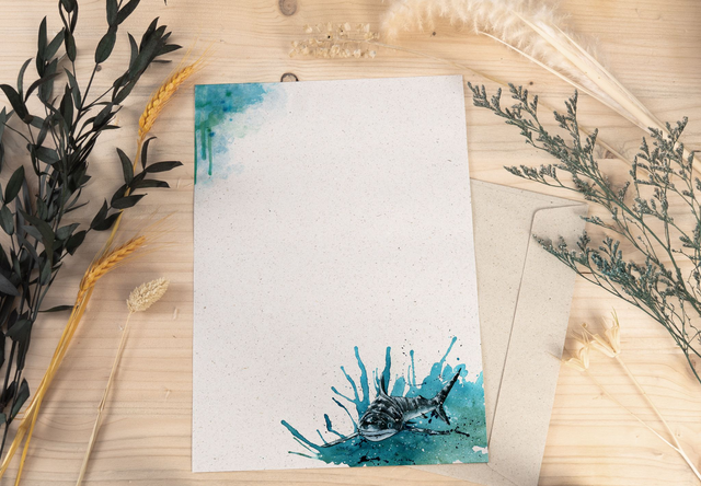 Tauche ein in die Tiefen des Meeres mit diesem umweltfreundlichen Briefpapier-Set, inspiriert vom kraftvollen Riffhai. Jedes Blatt und jeder Umschlag sind mit einem handgemalten Riffhai-Motiv gestaltet, das perfekt die Eleganz und Stärke dieser faszinierenden Kreatur einfängt. Gedruckt auf nachhaltigem Graspapier, ist dieses Set nicht nur umweltfreundlich, sondern verleiht deinen Nachrichten auch einen individuellen, künstlerischen Charakter.