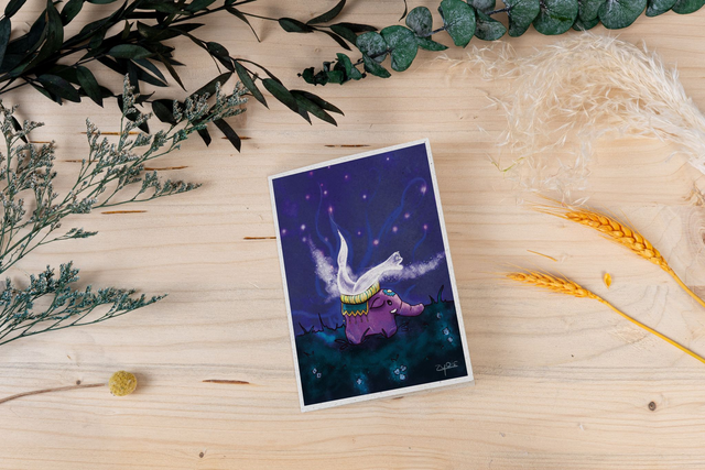 Diese liebevoll illustrierte Grußkarte zeigt einen farbenfrohen Elefanten der bei Nacht mit seiner Geisterfreundin unterwegs ist. Sie tanzen unter zauberhaften Sternen und Lichtschweifen. Perfekt für alle, die fantasievolle Grüße mit einem Hauch Magie versenden wollen.
