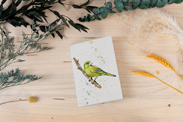 Grünfinken sind nicht nur wunderschön anzusehen, sondern auch echte Überlebenskünstler in unseren heimischen Wäldern und Gärten. Diese handgemalte Grünfink-Karte bringt ein Stück Natur direkt zu Dir nach Hause. Das minimalistische, detailreiche Design auf umweltfreundlichem Graspapier fängt den Charakter dieses besonderen Vogels perfekt ein. 💚🐦