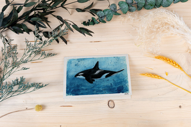 Tauche ein in die faszinierende Unterwasserwelt mit dieser handgemalten Orca-Karte auf Graspapier.