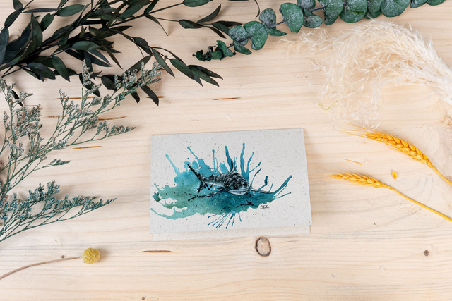 Das handgemalte Aquarellmotiv, gedruckt auf nachhaltigem Graspapier, fängt die Anmut und Eleganz des Riffhais ein. Die Details und Farbverläufe des Bildes machen es zu einem echten Blickfang. Perfekt geeignet als Grußkarte, Geschenk oder zum Sammeln – ein Highlight für alle Hai-Liebhaber und Fans der Meereswelt.