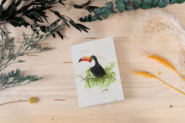 Mit seinem auffälligen Schnabel und den leuchtenden Farben ist dieser Tukan in Aquarell ein fröhlicher Hingucker. Die harmonische Komposition aus satten Farben und feinen Pinselstrichen verleiht der Karte einen exotischen Touch. Gedruckt auf Graspapier – eine farbenfrohe und umweltfreundliche Wahl.