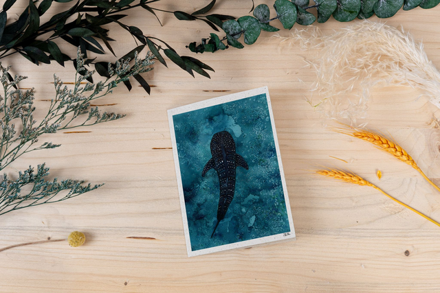 Das Aquarellmotiv besticht durch seine Farbintensität und wird auf umweltfreundliches Graspapier gedruckt, was der Karte einen einzigartigen, natürlichen Charme verleiht. Diese Walhai-Karte ist eine wunderbare Hommage an das größte aller Haie und die beeindruckende Unterwasserwelt.