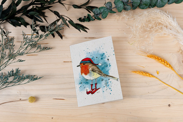 Ein charmantes Rotkehlchen mit Mütze und Wollsocken auf hochwertigem Graspapier. Perfekt als winterliche Grußkarte oder Klappkarte, begleitet von einem natürlichen Graspapierumschlag. Diese Karte zaubert jedem ein Lächeln ins Gesicht.💚🐦