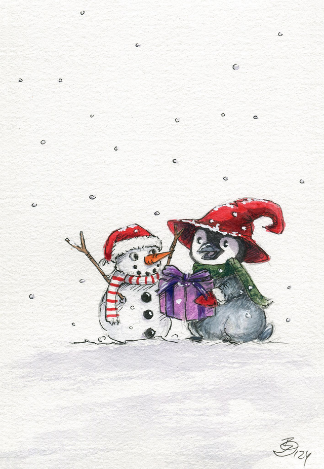 Dieses zauberhafte Aquarell zeigt einen kleinen Pinguin, der seinem Schneemann-Freund ein Geschenk überreicht – beide dick eingepackt in Mütze und Schal, während der Schnee um sie herum fällt. Das Bild ist auf glitzerndem Aquarellpapier gemalt, was dem Motiv eine festliche, leicht schimmernde Note verleiht. Ein winterlicher Hingucker, der einfach gute Laune verbreitet und perfekt die Freude der Weihnachtszeit einfängt!